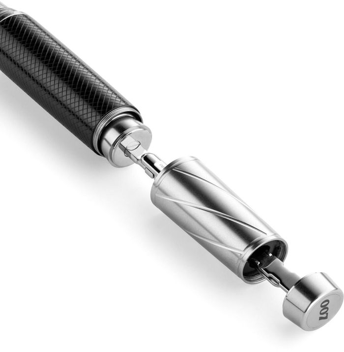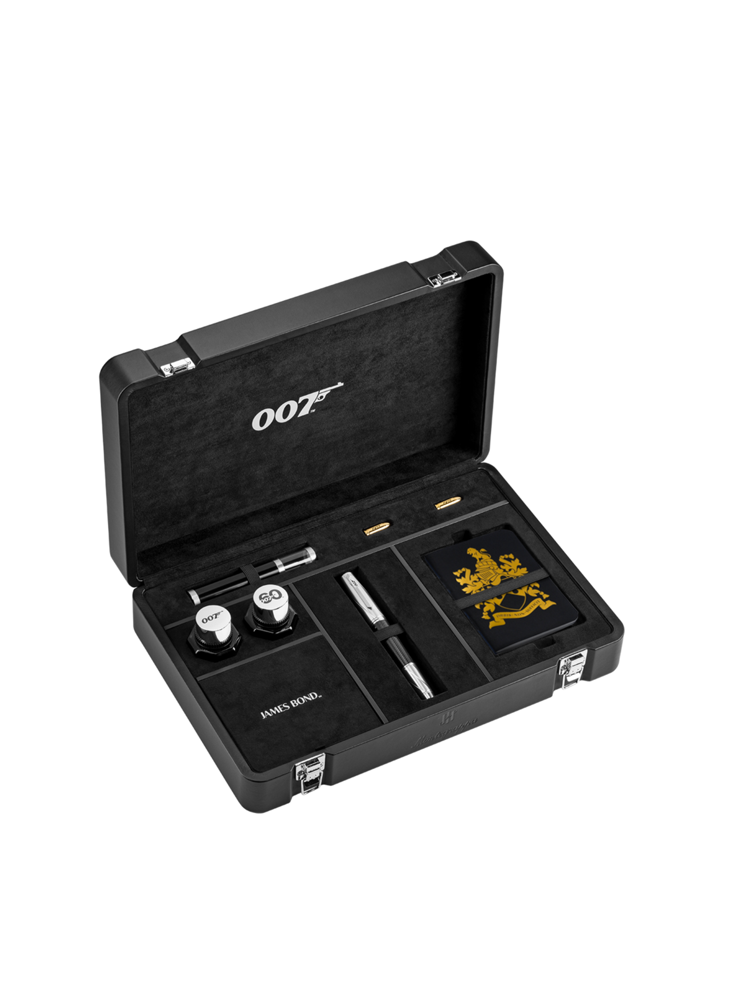 Secret gadgetry. A false barrel segment conceals a set of cufflinks that can be extracted and locked back into place according to need. Each is emblazoned with Bond’s iconic 007 logo.