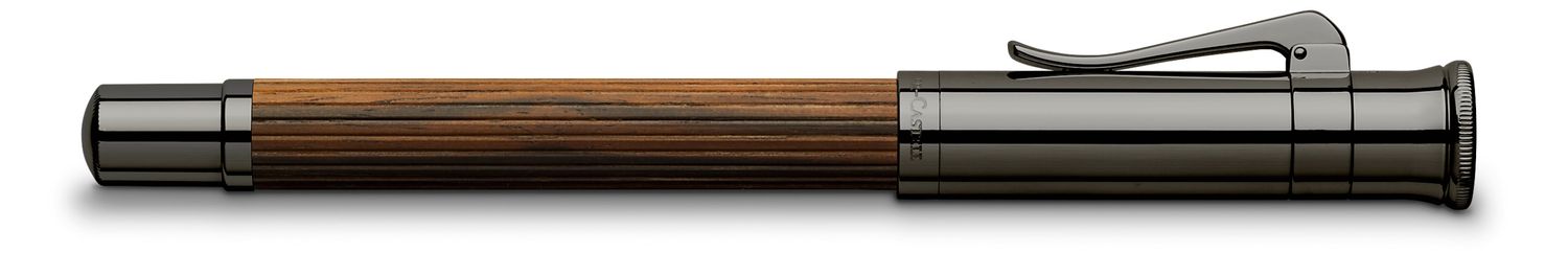 Barrel made of Macassar wood PVD-coated metal parts made of titanium Solid, spring-loaded clip Handmade, 18-carat gold nib with ruthenium coating Run in by hand Fountain pen available in 6 different nib widths: M (medium), F (fine), EF (extra fine),B (broad), OM (left slend/medium),