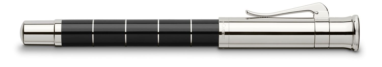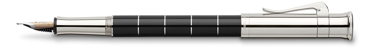Barrel made of precious resin decorated with fine platinum-plated metal rings, Black Platinum-plated metal parts Solid, spring-loaded clip Handmade, bicoloured 18-carat gold nib with iridium tip Run in by hand Fountain pen available in 6 different nib widths: M (medium), F (fine), EF (extra fine), B