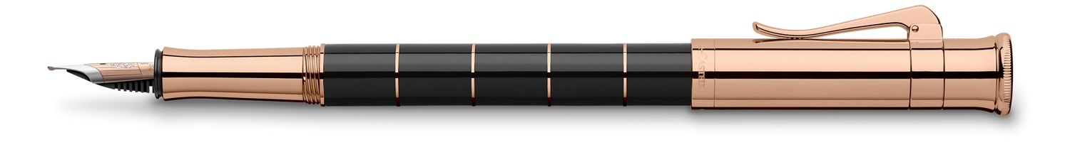 Barrel made of precious resin decorated with fine rose gold-plated metal rings, Black Solid, spring-loaded clip Handmade, bicoloured 18-carat gold nib with iridium tip Run in by hand Fountain pen available in 6 different nib widths: M (medium), F (fine), EF (extra fine), B (broad)