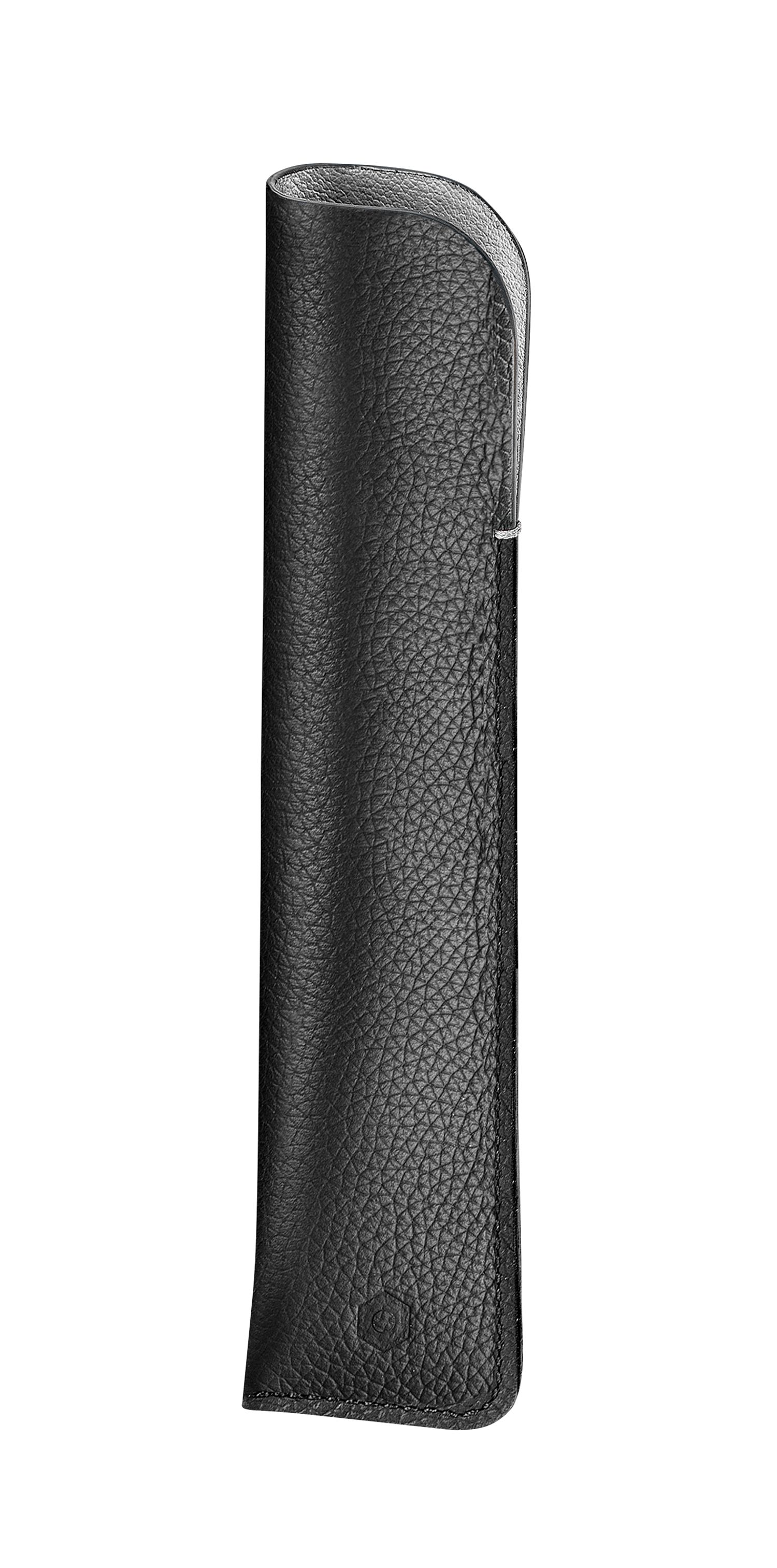 Black grained cowhide leather with smooth silver interior in the colour of the pen